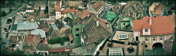 From the top, the view is stunning. The colour of these ancient houses against the bright blue of the sky and the cream of the walls, the Târnava Mare running into it, the green mountains nearby – everything – makes for one devilish sight. I go from one side to the other, checking for nothing. Just looking at my two-fold city spread out in one-fold. The view from the top, a vertical-downward view is different from the horizontal-upward angled view.