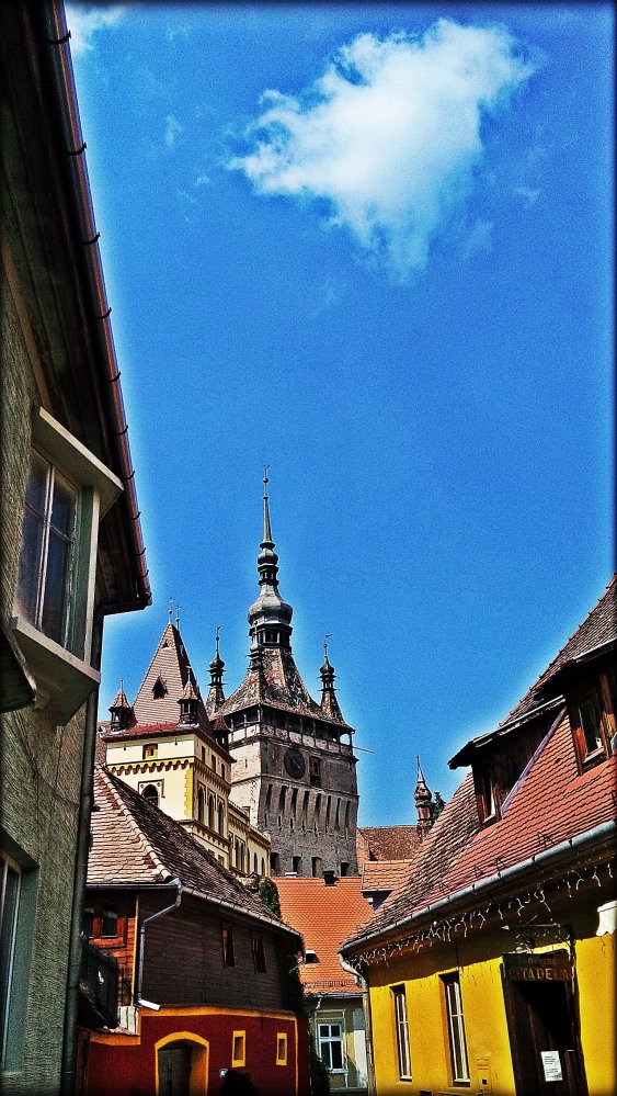 I’m dropped off at a car park in the lower town. A wet Wednesday morning opens Sighișoara theatrically to me. It’s difficult to take it all in. It seems right, that Vlad the Impaler, should have been born here. Towers and turrets rise in ominous defiance. Bright coloured houses of yellow, orange, green, blue and their faded, time worn variants seem to spiral around this sudden outgrowth of earth in the midst of flatland. A sudden outgrowth of ancient in the middle of a tar-paved road with speeding cars. Green mountains loom all around and the rain begins to fall.