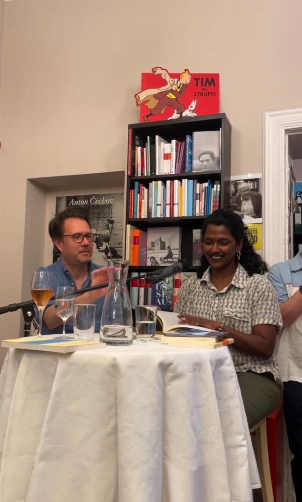 ☁️ 13.07.2023, Poesie und Rose: Ein Sommerabend mit der Zeitschrift ‚Sinn und Form’, mit Matthias Weichelt und Durs Grünbein, Ferlemann und Schatzer Buchladung, Berlin. Read from „Ein Panzer, ein Battailon, ein Banyanbaum“ and „Amma knows the way“.